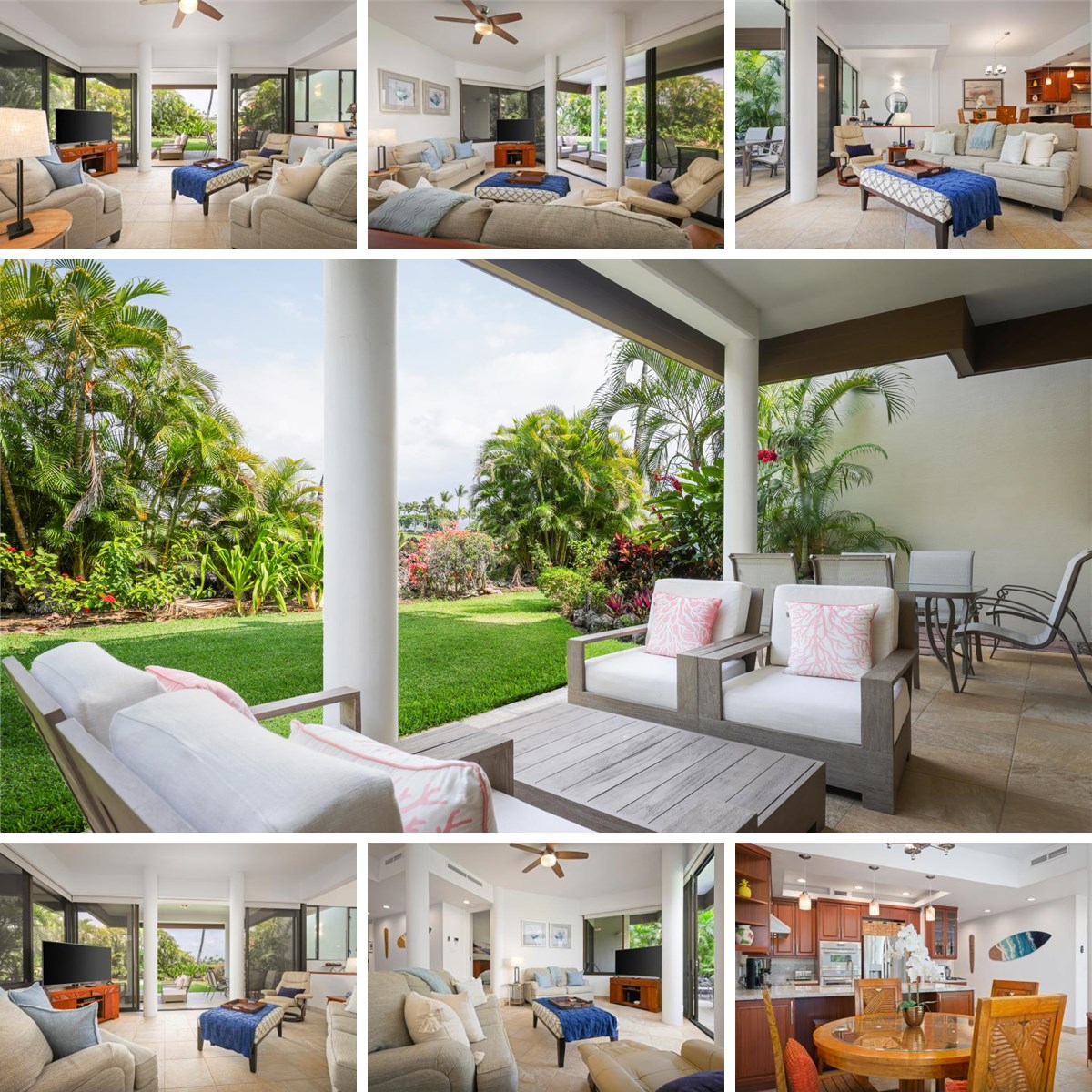 The open concept floor plan is designed for comfort and effortless indoor outdoor living, featuring central air conditioning, ceiling fans throughout, and tasteful island inspired finishes. The newly refreshed interior includes updated kitchen and bathrooms, complemented by professional tile cleaning throughout for a bright, move in ready presentation. The spacious living area opens to an expansive lanai, ideal for dining, relaxing, and enjoying the surrounding island beauty.